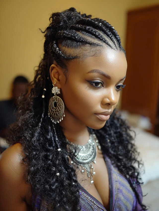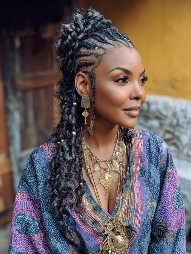Combines structured braids with natural texture for dynamic style.
