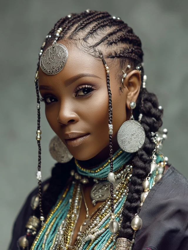 Cornrows and side braids accented with cowry shells or colorful beads.