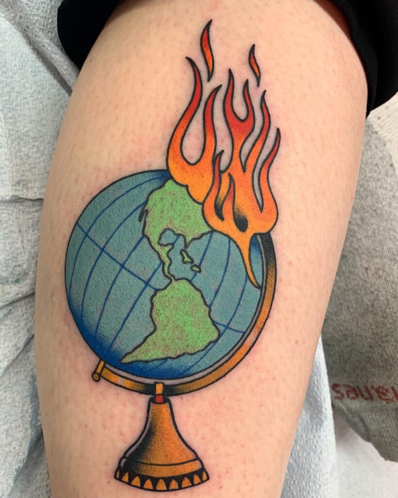 Here, the globe rests on a simple golden stand, but flames erupt from its top, transforming the tattoo into a striking metaphor. The detailed gridlines and realistic continents contrast sharply with the surreal, blazing fire. The fiery orange and red shades dominate, symbolizing urgency, passion, or perhaps a statement on global issues.
