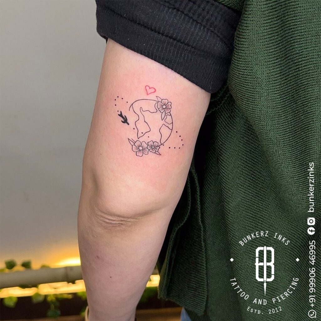 This delicate tattoo features a simple line drawing of the Earth, accented with flowers, a tiny heart, and a plane. The dotted circular path around the globe suggests movement, travel, and infinite possibilities. Its minimalistic nature makes it lightweight, subtle, and meaningful without being overwhelming.