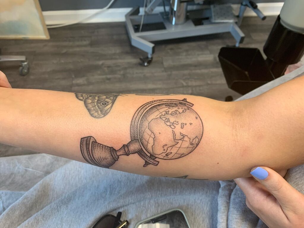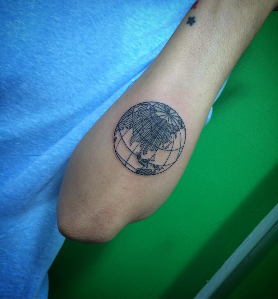 A perfectly round globe tattoo rests neatly on the elbow, its precise black lines showing continents and latitude/longitude details. Its placement makes it stand out with every arm movement, adding a dynamic quality to the tattoo. The design feels both geometric and organic, a balance between science and art.