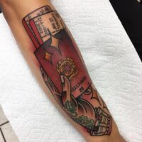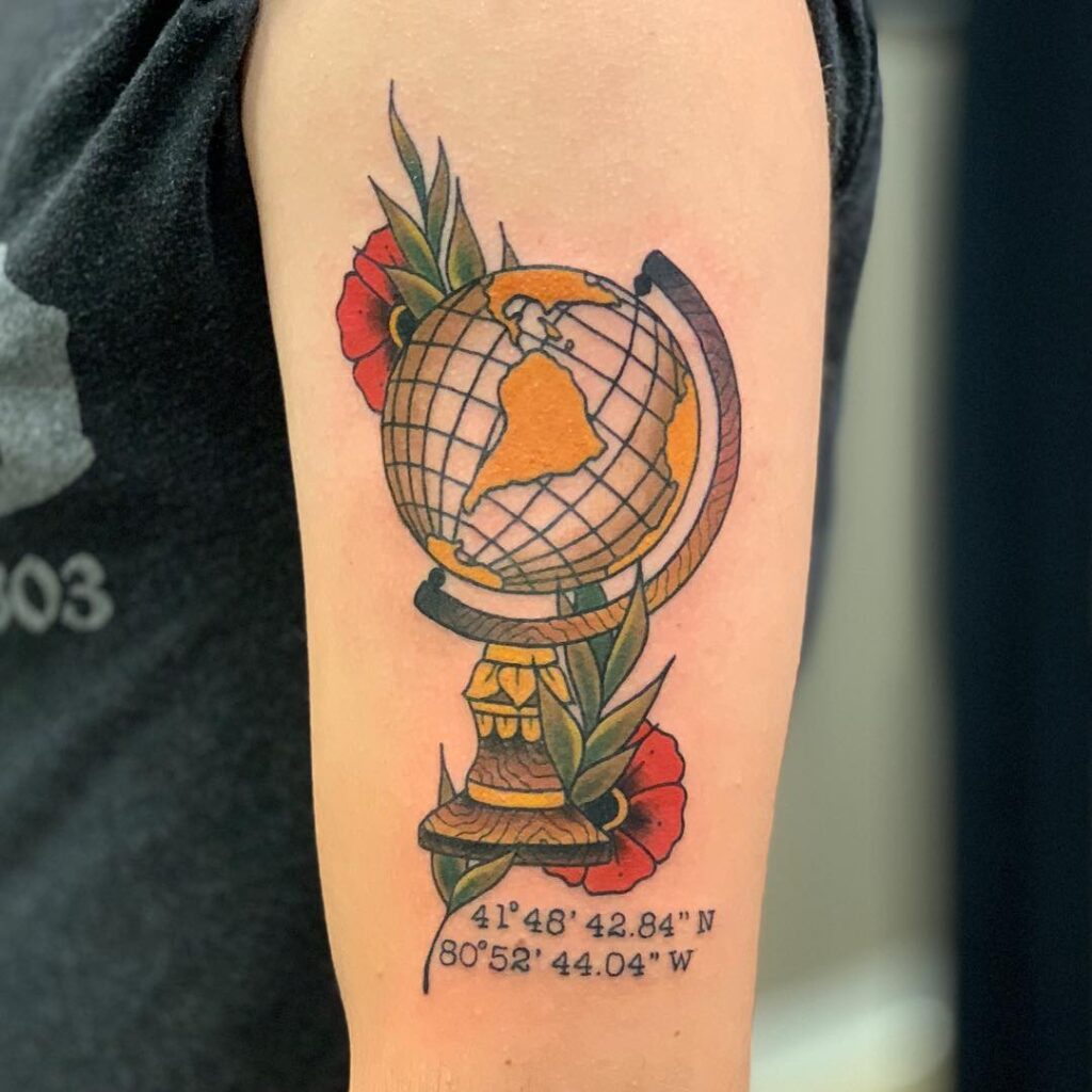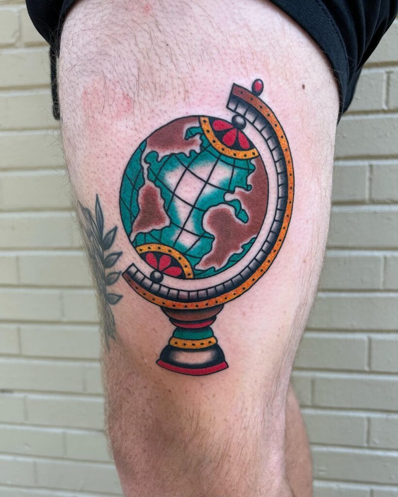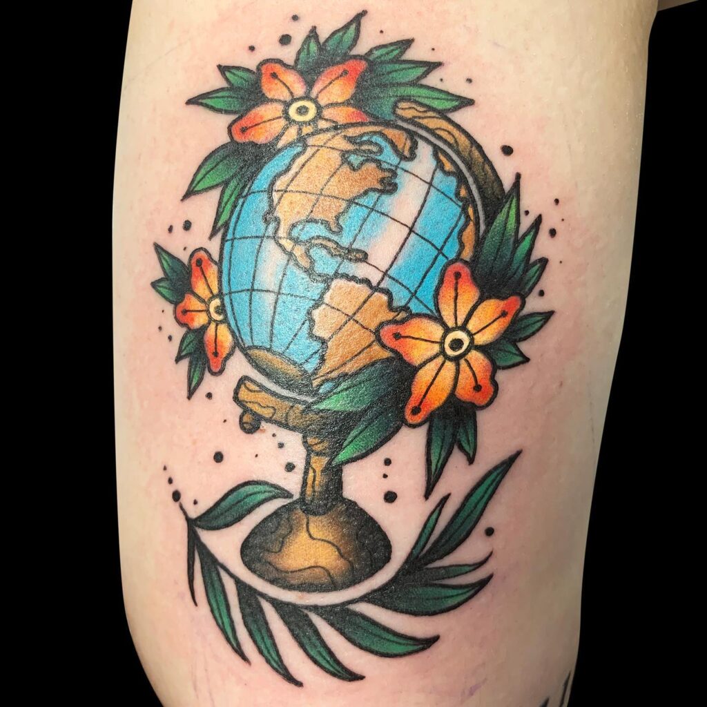 This tattoo blends a classic globe design with bold floral elements, creating a striking old-school look. The globe itself is detailed with rich blue oceans and brown continents, while the surrounding flowers add warmth and natural balance. The yellow and red stand enhances the vintage aesthetic, tying it to the timeless tattoo tradition.