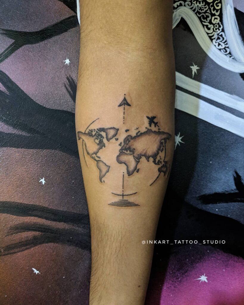 This tattoo merges a dotted world map outline with two travel symbols: an airplane and a paper plane. The planes’ trajectory arcs across continents, adding a sense of movement and direction. The shading and minimal detailing create balance between modern design and meaningful storytelling.
