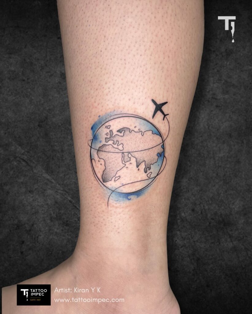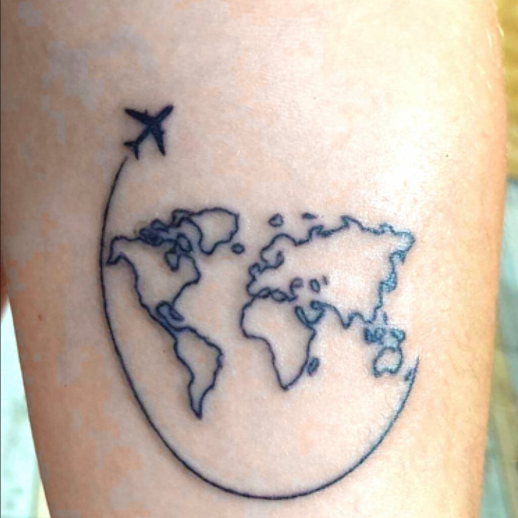 This design strips the concept of a globe down to its essentials—a clean black outline of the continents paired with a simple plane silhouette. The circular arc implies motion, capturing the feel of a flight path around the Earth. Its minimal strokes make it lightweight and elegant, easy to place anywhere on the body.