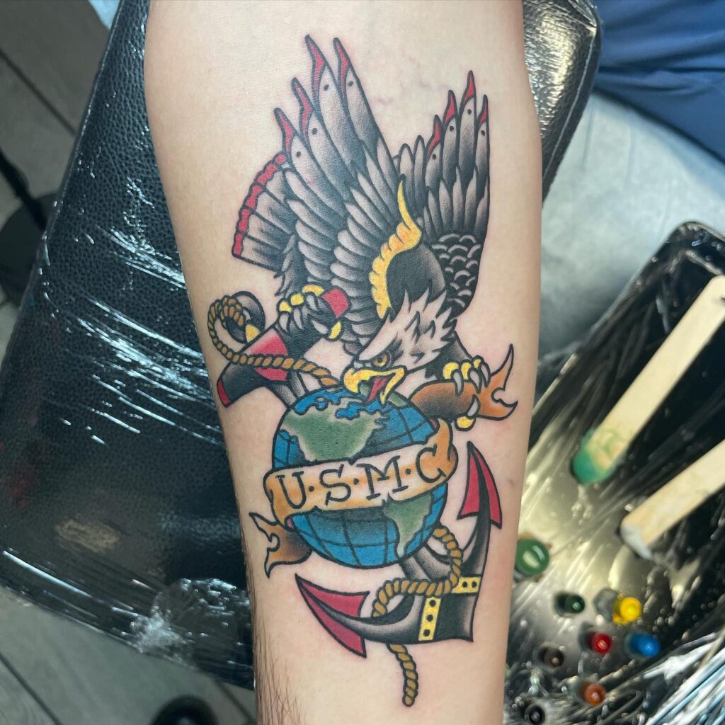 This bold tattoo proudly features the U.S. Marine Corps emblem—an eagle clutching a banner with “U.S.M.C.” across a globe, anchored by nautical elements. The eagle’s wings stretch wide, its talons gripping firmly, symbolizing strength, protection, and patriotism. The bold red and gold accents add authority and vibrance.