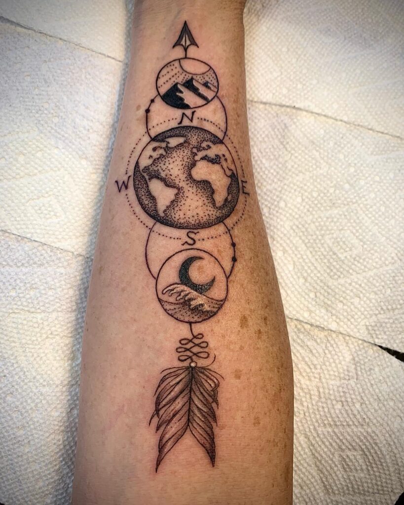 This tattoo combines a compass, a globe, and natural elements into one intricate design. The central globe is rendered in dotwork style, surrounded by smaller circles featuring mountains, waves, and the moon. A feather hangs below, tying the piece together like a dreamcatcher.