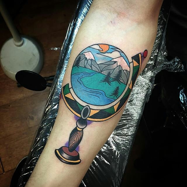 Inside the globe frame lies a picturesque scene of snow-capped mountains, evergreen trees, and a river flowing beneath a vibrant sun. This creative twist replaces continents with nature, blending geography with landscape art. Bright blues, greens, and oranges give the tattoo a dreamlike charm.