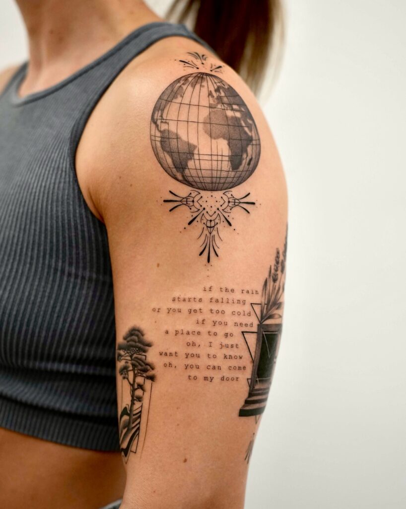 Placed prominently on the shoulder, this tattoo features a large, shaded globe with precise detail, surrounded by ornamental flourishes that elevate its elegance. The globe appears realistic, while the patterns around it add an artistic and almost spiritual aura. Below, complementary tattoos and script further enhance the composition.