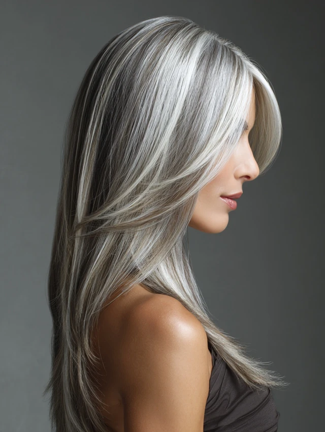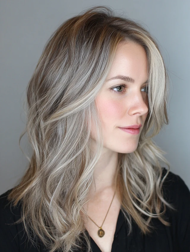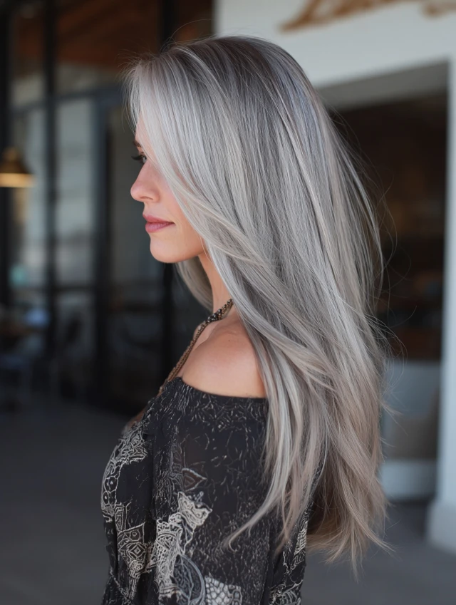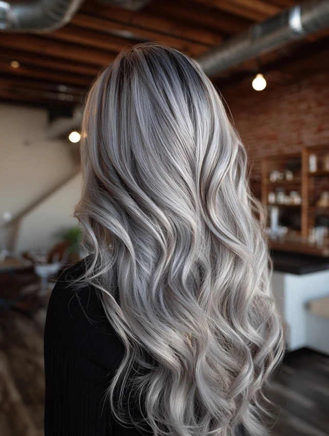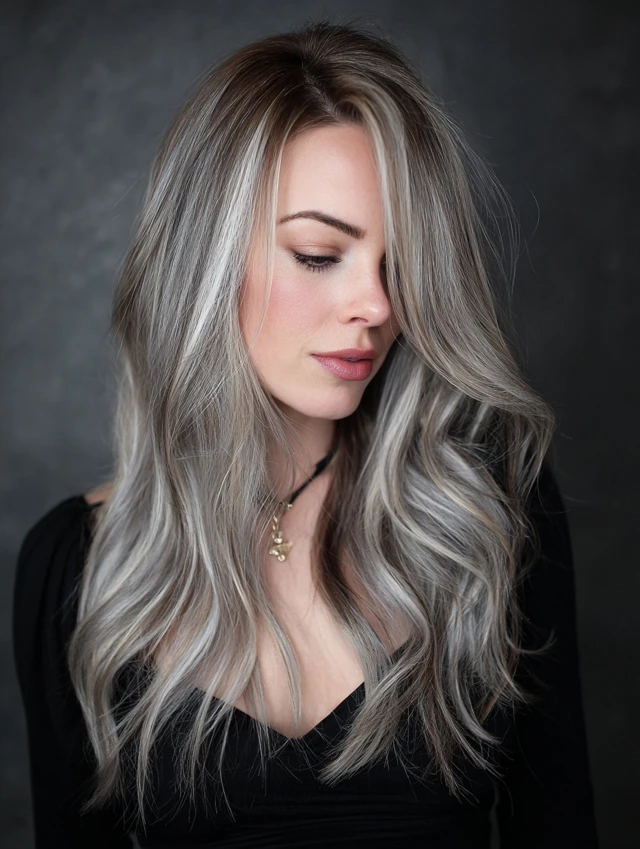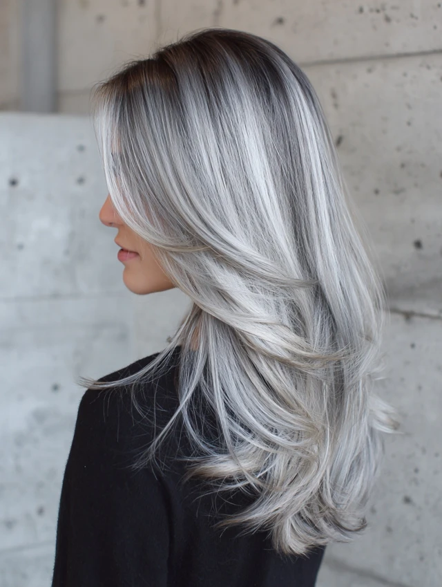 Balayage creates a soft, natural transition from darker roots to silvery ends, adding depth and shine.