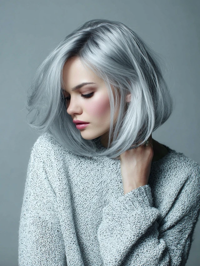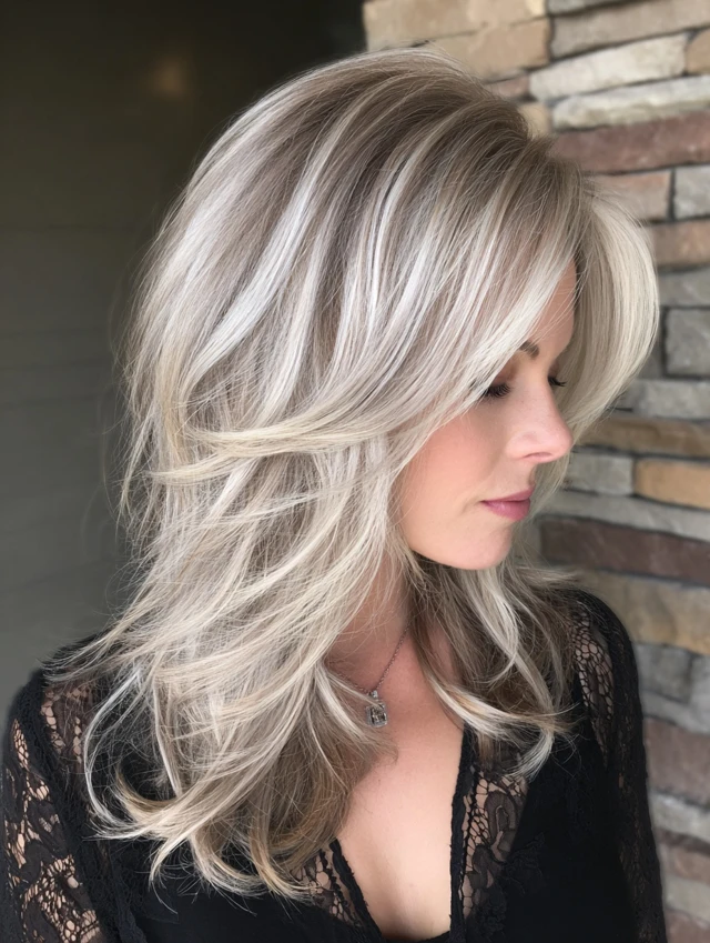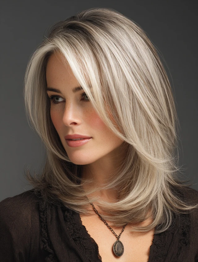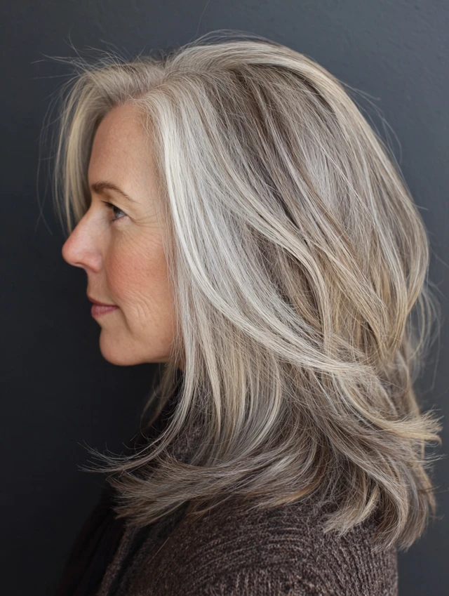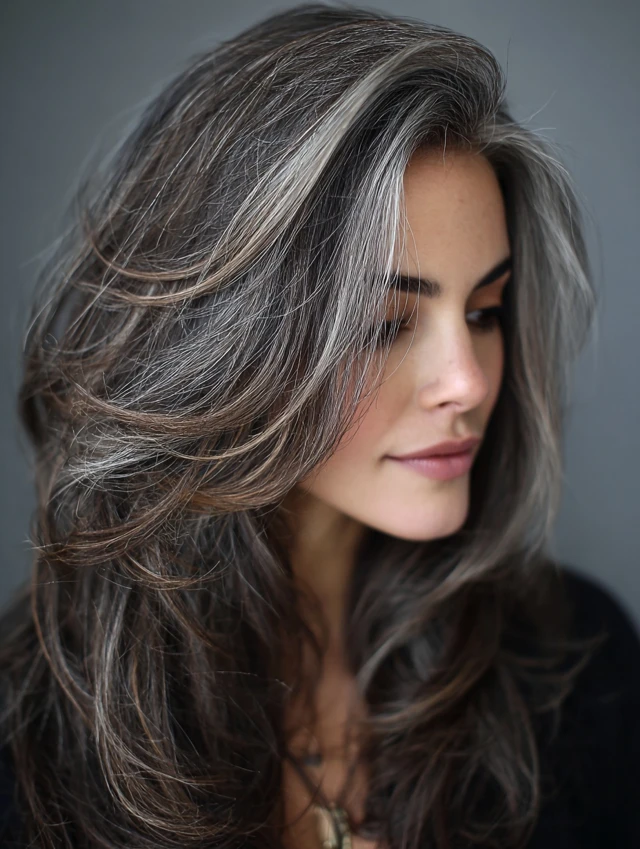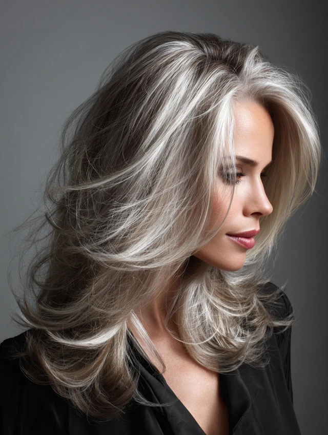 Balayage creates a soft, natural transition from darker roots to silvery ends, adding depth and shine.