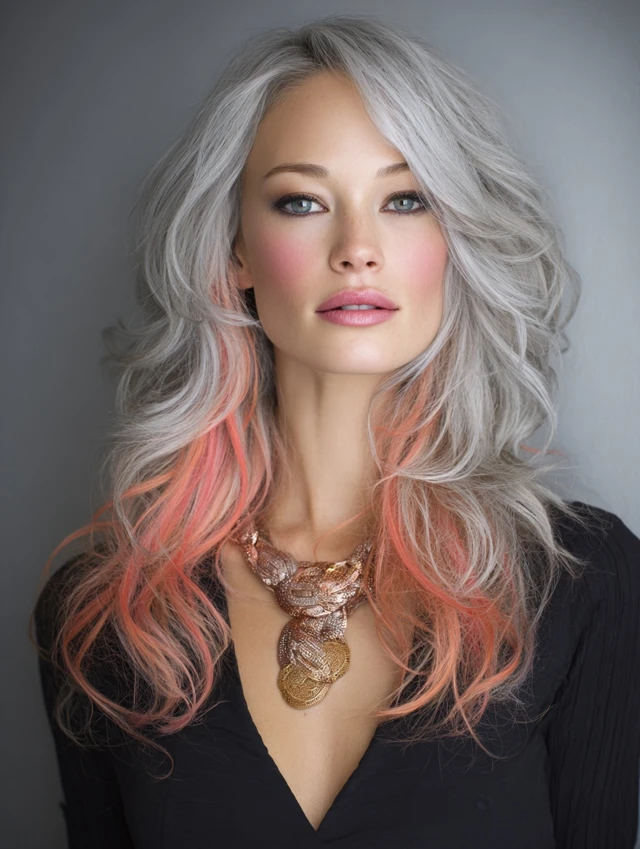 Soft pastel or rose gold highlights add creativity and fun without overpowering gray hair. Perfect for modern, playful styles.