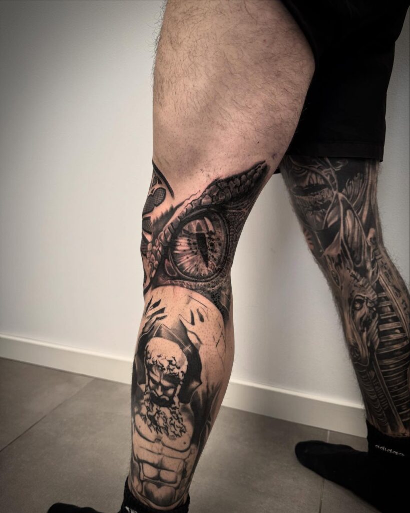 This powerful leg tattoo blends mythology and realism, featuring a striking reptilian eye above a muscular, statue-like figure. The eye, detailed with scales and texture, symbolizes awareness, vigilance, and primal instinct, while the figure below radiates strength and endurance.