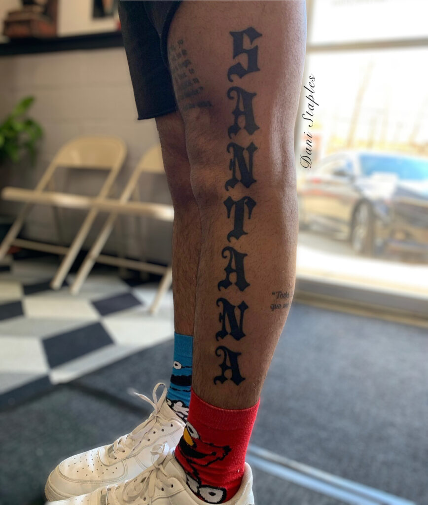 Bold and unapologetic, this leg tattoo features the name “SANTANA” inked vertically in Gothic lettering down the side of the calf. Its large, blackletter style demands attention, embodying strength, loyalty, and personal identity. Script tattoos like this often carry deep personal meaning, honoring a family name, heritage, or a person of great significance.