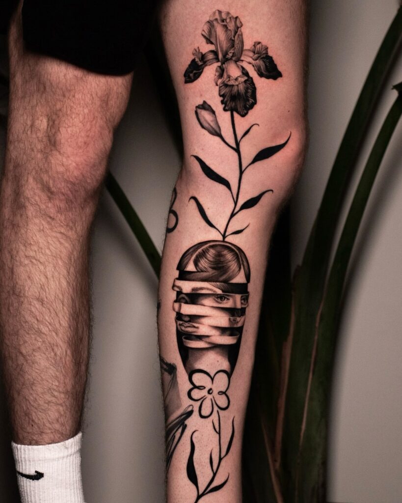 A stunning fusion of surrealism and realism, this leg tattoo blends floral elements with a fragmented portrait. The intricate iris flower extends above, symbolizing wisdom and renewal, while the sliced face design beneath adds mystery and depth.