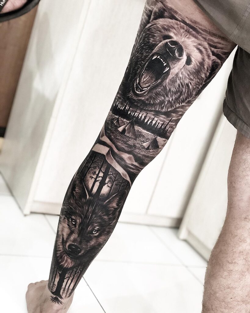 This stunning leg sleeve tattoo captures the essence of the wild with hyper-realistic depictions of a roaring bear, a howling wolf, and a forest landscape with tents. The bear, fierce and protective, represents raw strength and courage, while the wolf embodies loyalty, survival, and connection to nature.