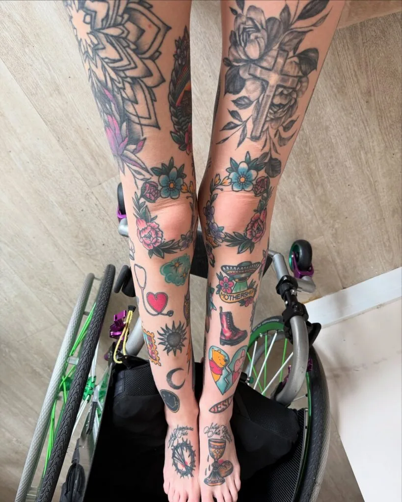 This tattooed leg is a canvas of vibrant art, filled with a mix of traditional and modern elements. From flowers and hearts to cartoon-inspired figures and bold symbolic imagery, the eclectic collection showcases personality and creativity.