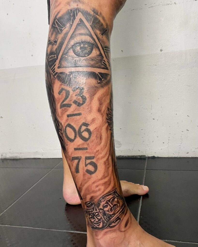 This tattoo combines powerful symbolism with bold black-and-gray work. Dominated by the all-seeing eye within a triangle and surrounded by Roman numerals, it conveys themes of wisdom, enlightenment, and higher vision. The numbers “23-06-75” suggest a personal date, adding intimate meaning to the piece. Below, two theatrical masks—symbolizing joy and sorrow—enhance the emotional depth, representing life’s balance between comedy and tragedy.