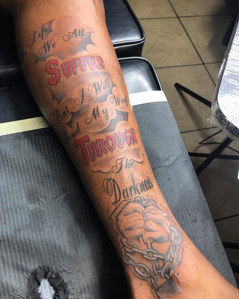 Beneath the script lies an image of two clenched fists bound by chains, symbolizing struggle, resilience, and the will to break free. The overall composition captures hardship, perseverance, and strength in the face of adversity. This tattoo is not just decoration—it’s a deeply personal reminder of endurance and hope, written permanently in both words and imagery.
