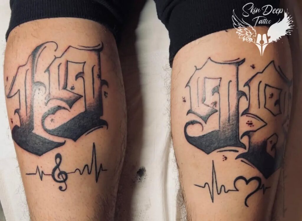 This tattoo features bold Gothic lettering inked across both legs, flanked by heartbeat lines. The script is shaded in black and gray with strong contours, giving it a dramatic, old-English style. Beneath, a treble clef connects to a heartbeat, blending music and life into one visual rhythm.