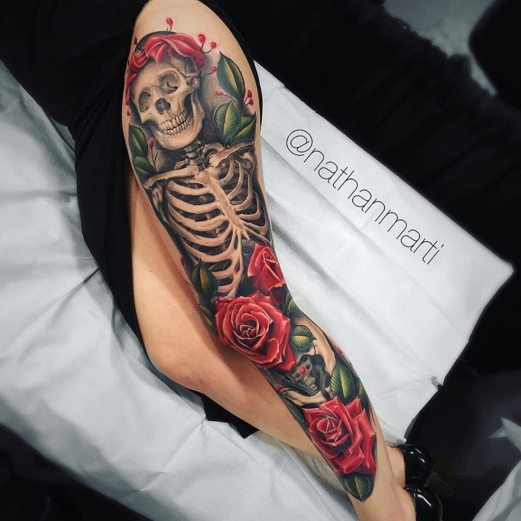 This dramatic leg tattoo showcases a detailed skeleton entwined with lush red roses and green leaves. The contrast between the skeletal figure and vibrant florals creates a powerful image of life and death, beauty and decay. The red roses symbolize love, passion, and remembrance, while the skeleton evokes mortality and transformation.