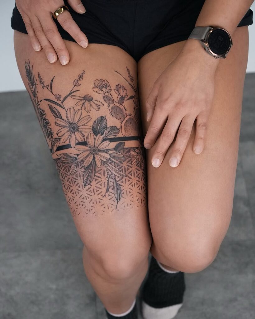 This thigh tattoo is a graceful composition of flowers, leaves, and geometric mandala patterns. Blooming daisies, cacti, and sprigs of lavender bring softness and natural beauty, while the lower mandala pattern adds structure and balance. The tattoo blends organic and geometric forms seamlessly, symbolizing harmony between nature and order.