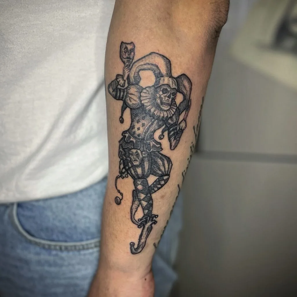 This bold design features a skeletal jester holding a theater mask, detailed with intricate linework. It’s a striking piece that combines dark humor, life’s duality, and a playful edge.