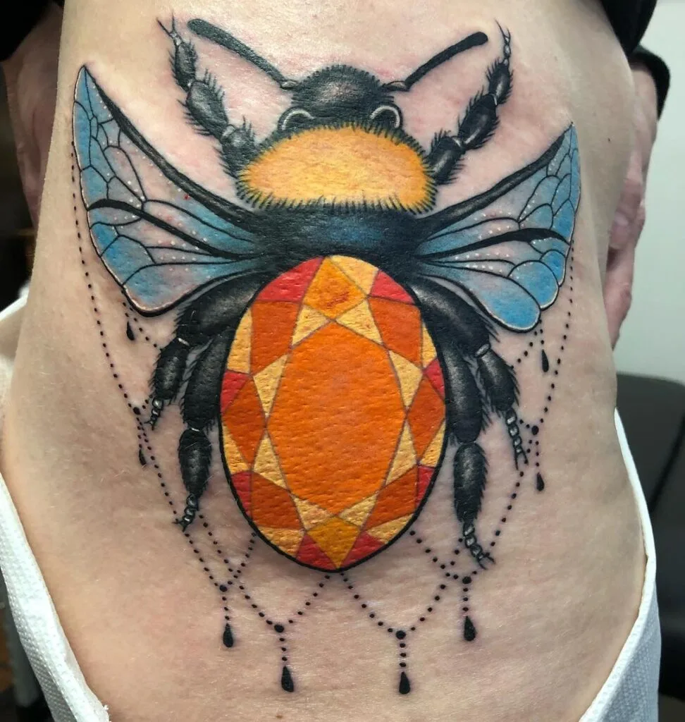 This colorful bee tattoo is a true statement piece, featuring bright orange and yellow gem-like patterns on its body and delicately shaded wings. The dotted accents around the bee make it look like a piece of living jewelry.