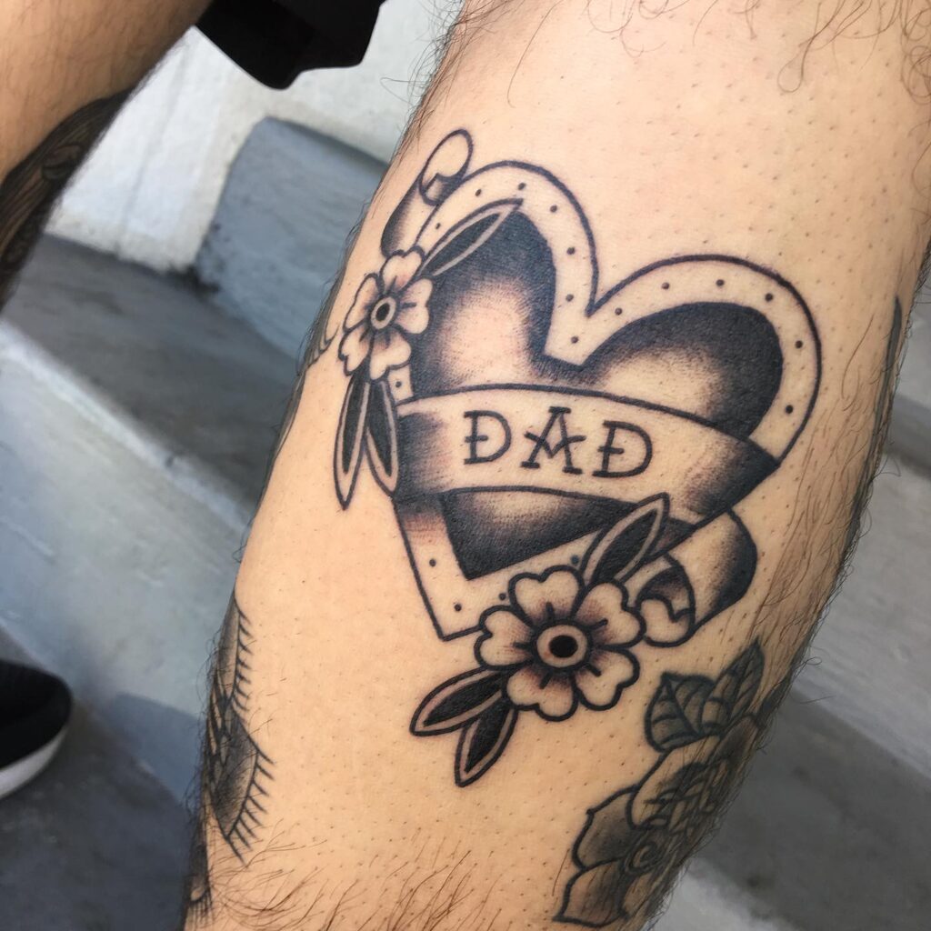 This traditional design features a bold heart wrapped with a banner inscribed with the word “Dad,” framed by classic flowers. The tattoo has an old-school feel with strong shading and timeless symbolism. The heart represents eternal love, while the flowers add softness and beauty to the tribute.