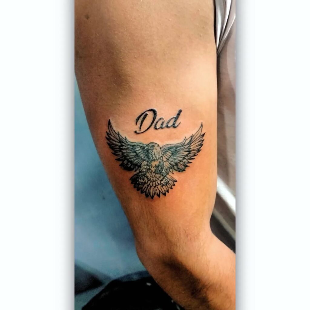 The placement on the arm gives it a commanding presence, making it both a tribute and a statement piece. The shading and feather details add depth and realism, giving the design an empowering look. This tattoo is ideal for anyone wanting to honor their father with a symbol of strength and freedom.