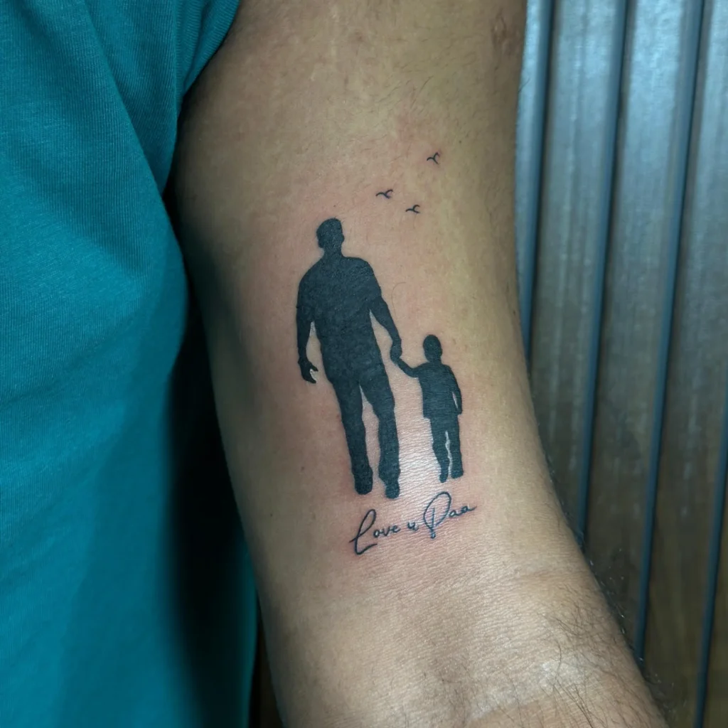 This touching tattoo showcases the silhouette of a father walking hand-in-hand with his child, accompanied by delicate flying birds above and the inscription “Love u Dad” below. The imagery reflects protection, nurturing, and companionship, while the birds symbolize freedom and guidance into the future.