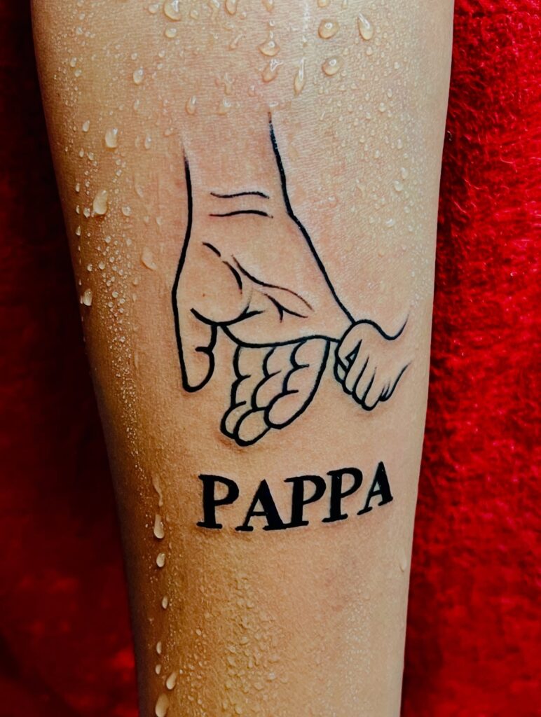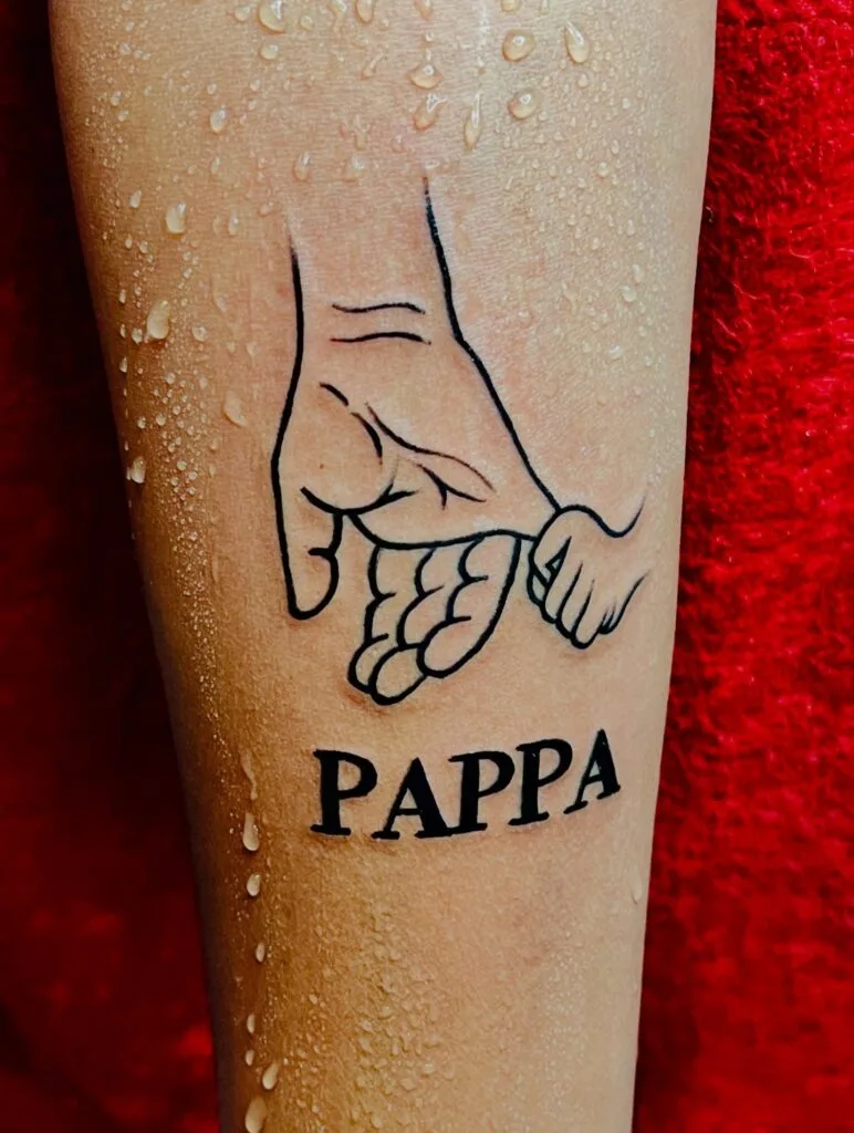 This tattoo depicts a large protective hand holding a child’s tiny hand, with the word “Pappa” written boldly beneath. It symbolizes strength, safety, and the protective nature of fatherhood.