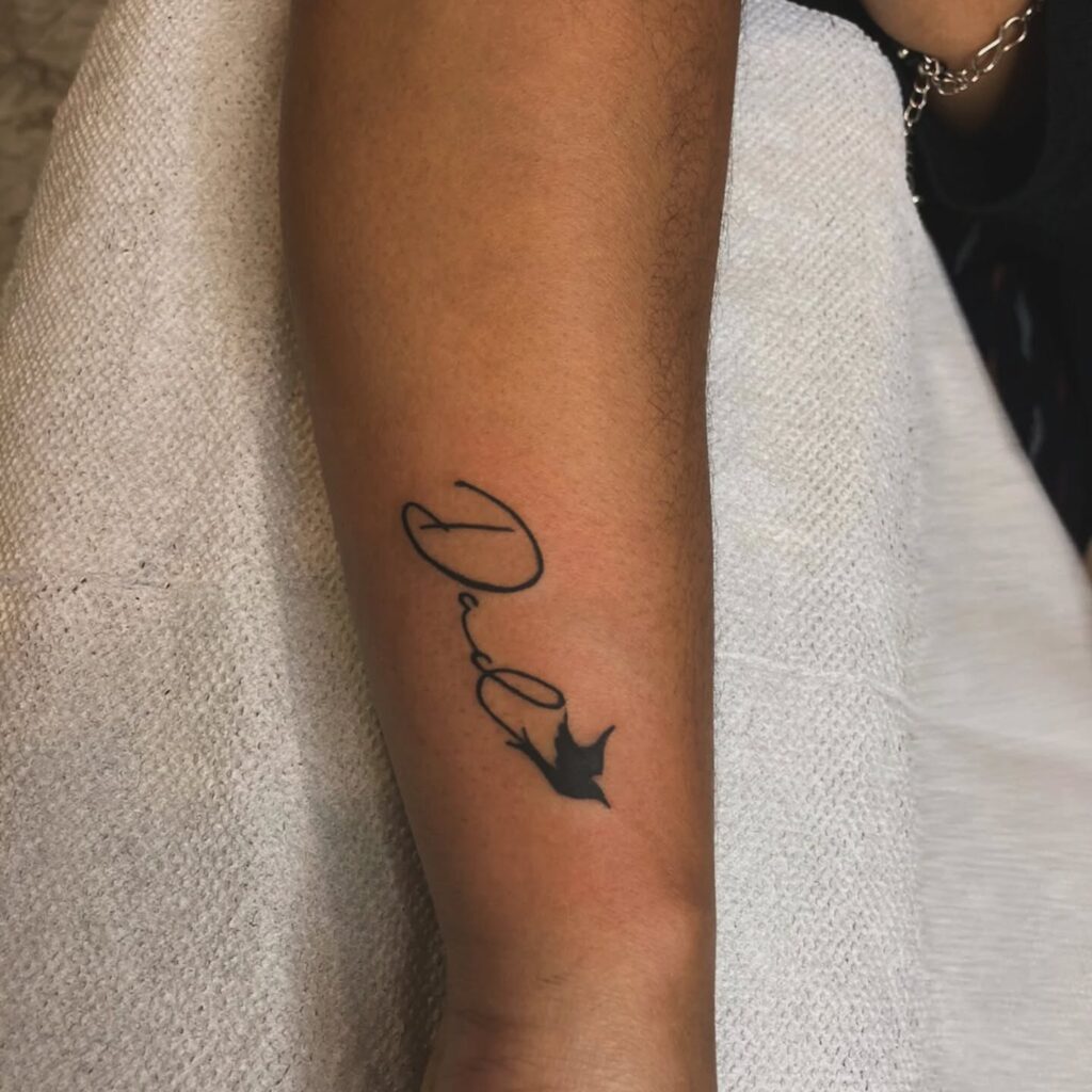 This tattoo combines elegant cursive script with imagery, spelling out “Dad” in flowing letters that seamlessly connect to the silhouette of a flying bird. The bird symbolizes freedom, guidance, and a soul’s eternal journey, making the design especially meaningful for those remembering a father who has passed.
