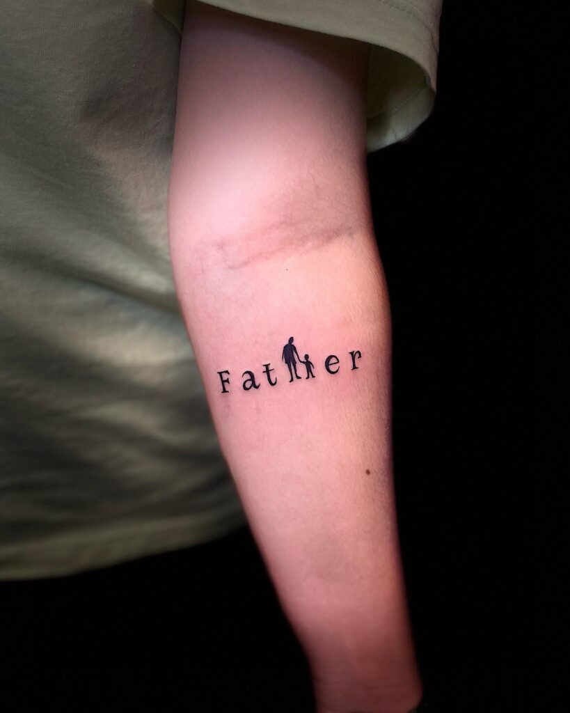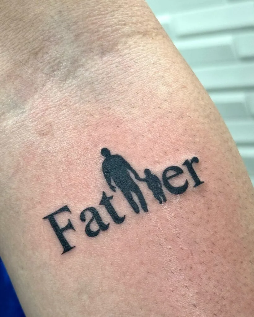 This tattoo creatively blends text and imagery, spelling the word “Father” with the silhouette of a dad and child forming the central “t.” The design symbolizes the inseparable bond between fatherhood and identity, showing how a parent is incomplete without their child and vice versa. It’s minimalistic yet powerful, capturing love and presence in a simple black-ink concept.