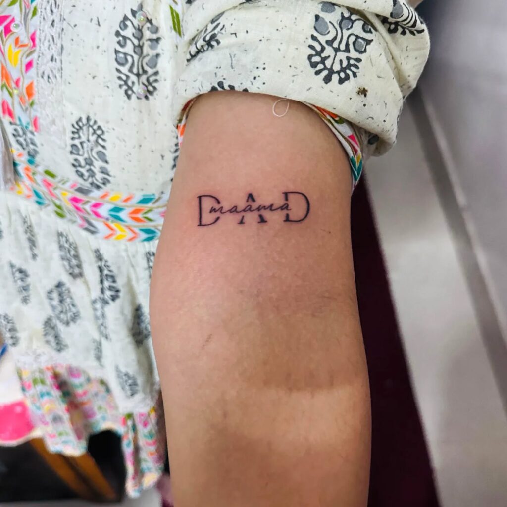 This tattoo smartly incorporates both “Dad” and “Maama” into a single design, creating a unique tribute to parental love. The lettering places “Maama” within the central “A” of “Dad,” showing how both parents form the foundation of family. Minimalist in style yet rich in meaning, this tattoo beautifully balances simplicity with emotional depth.