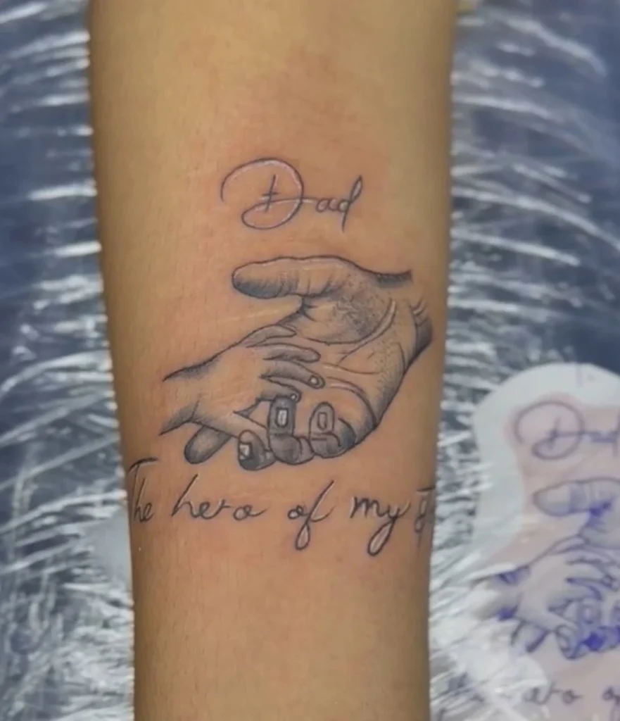 This tattoo blends imagery and text to create an emotional tribute. It features detailed artwork of a large protective hand holding a child’s tiny hand, symbolizing care and guidance. Above it, the word “Dad” is written in flowing script, while below, the words “The hero of my life” are inscribed.