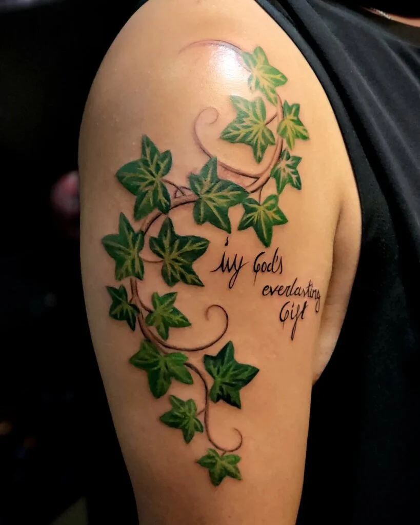 This tattoo features vibrant green ivy flowing along the upper arm, intertwined with delicate script that reads “Ivy God’s everlasting gift.” The leaves are shaded in multiple tones of green, creating dimension and lifelike texture that captures the plant’s natural beauty.