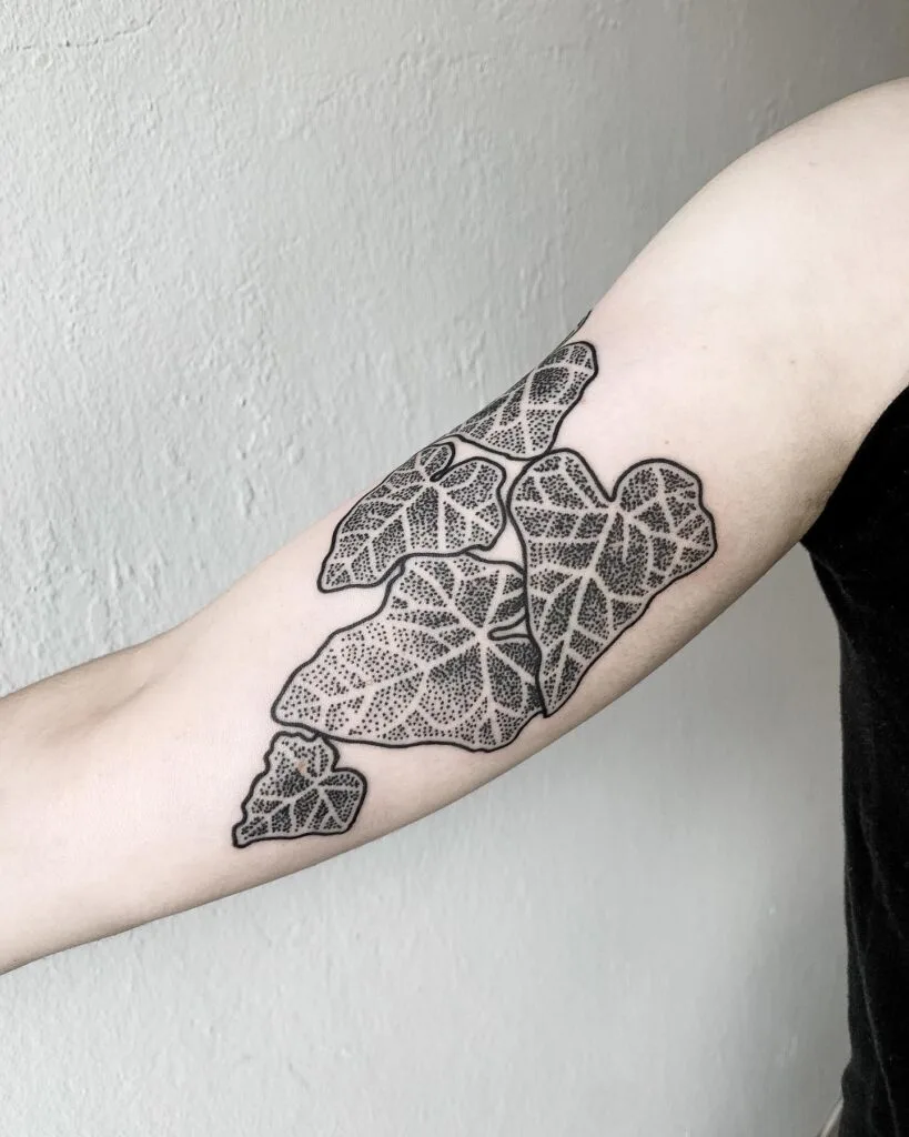 Placed on the arm, the design stands out as a modern take on ivy tattoos. Dotwork tattoos often reflect patience and precision, while ivy symbolizes perseverance, making this piece a powerful representation of both personal growth and artistic appreciation.