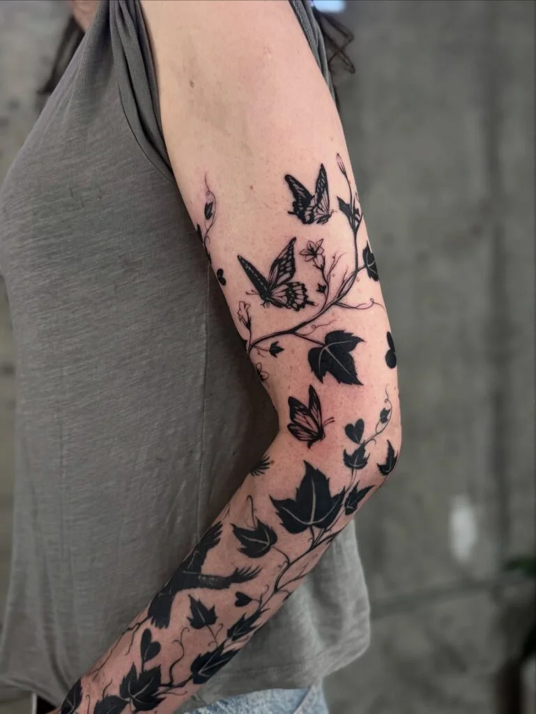 This large sleeve tattoo intertwines ivy leaves with fluttering butterflies, creating a dynamic and graceful composition. The solid black ivy contrasts sharply with the delicate, airy wings of the butterflies, bringing a balance of strength and freedom to the design.