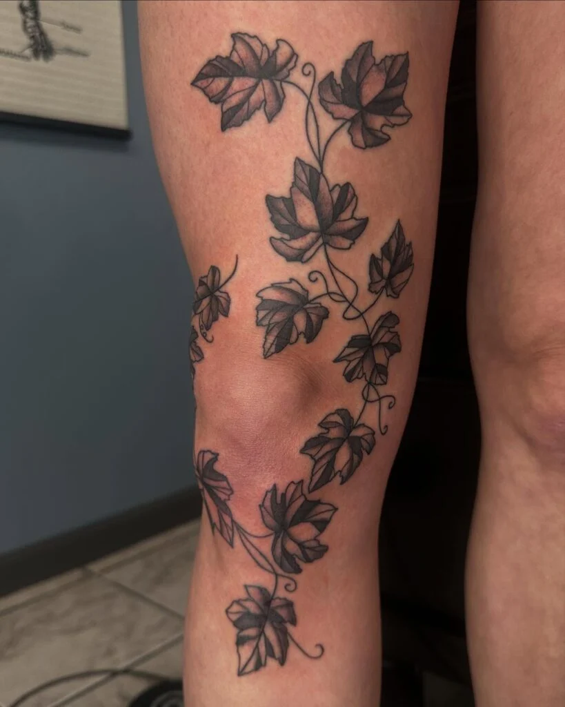 The placement across the knee emphasizes strength and flexibility, as ivy itself is a plant known for adaptability and persistence. The monochrome style keeps the focus on form and flow, making this piece a perfect example of timeless body art inspired by natural resilience.