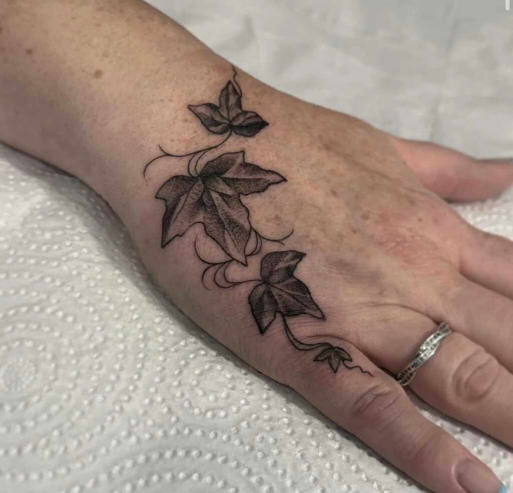 A hand tattoo carries bold symbolism, as it is always on display. The choice of ivy, known for loyalty and eternal bonds, adds depth to the design. This piece beautifully marries visibility with meaning, making it a striking yet personal work of art.