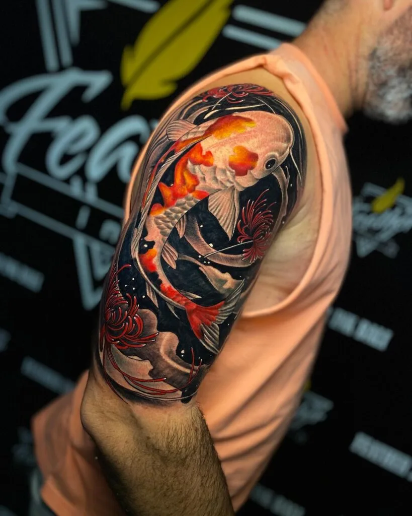4. Sleeve-Style Koi Fish Tattoo with Red Accents