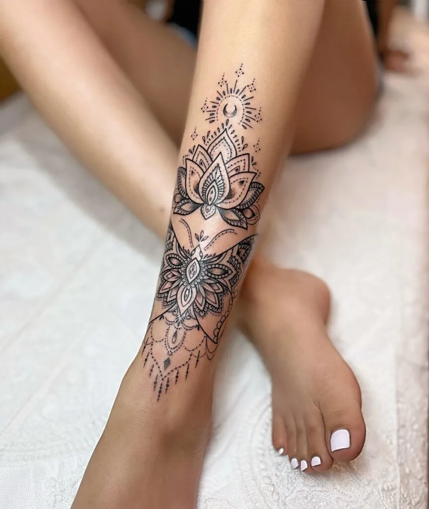 This mandala tattoo flows down the lower leg with an enchanting balance of floral motifs and ornamental details. The design incorporates lotus-like petals, crescent moons, and radiant sun symbols, embodying enlightenment, intuition, and cosmic balance. Fine linework and delicate dotting highlight the tattoo’s sophistication, while its vertical flow elongates the leg beautifully.