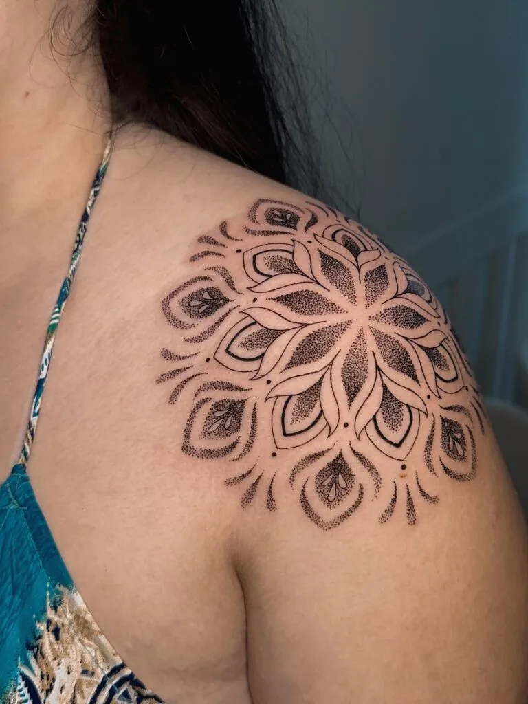 Placed delicately on the shoulder, this mandala tattoo radiates outward like a blooming flower. The design combines clean line work with dot shading to add depth and softness. Each petal symbolizes strength and femininity, while the balanced structure reflects unity and protection.