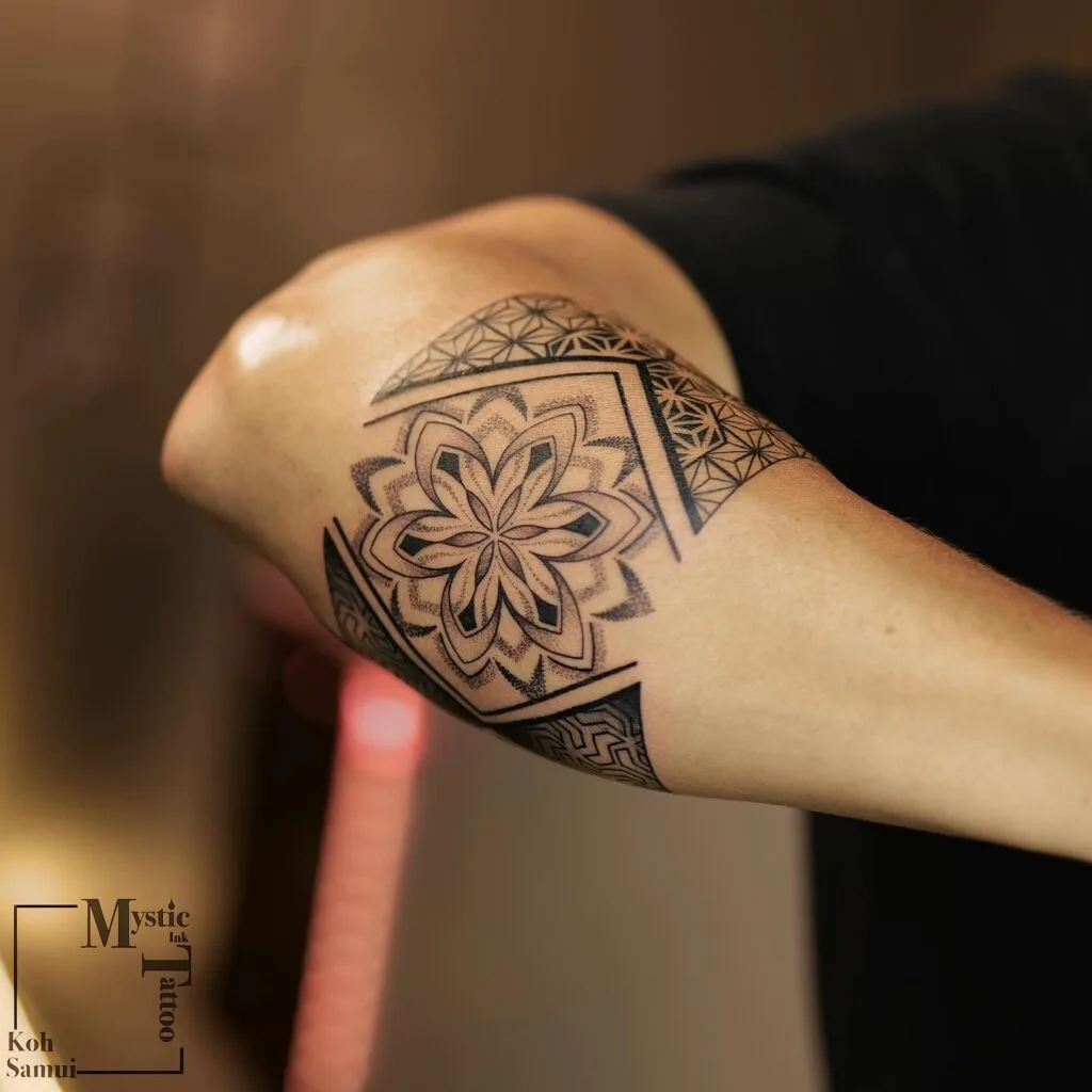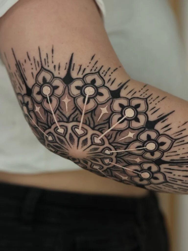 This elbow mandala tattoo blends floral patterns with geometric detailing, forming a striking centerpiece. The central flower radiates outward, symbolizing strength and transformation, while surrounding shapes create balance and symmetry. Dot shading enhances the depth, giving the tattoo a textured and dimensional appearance.