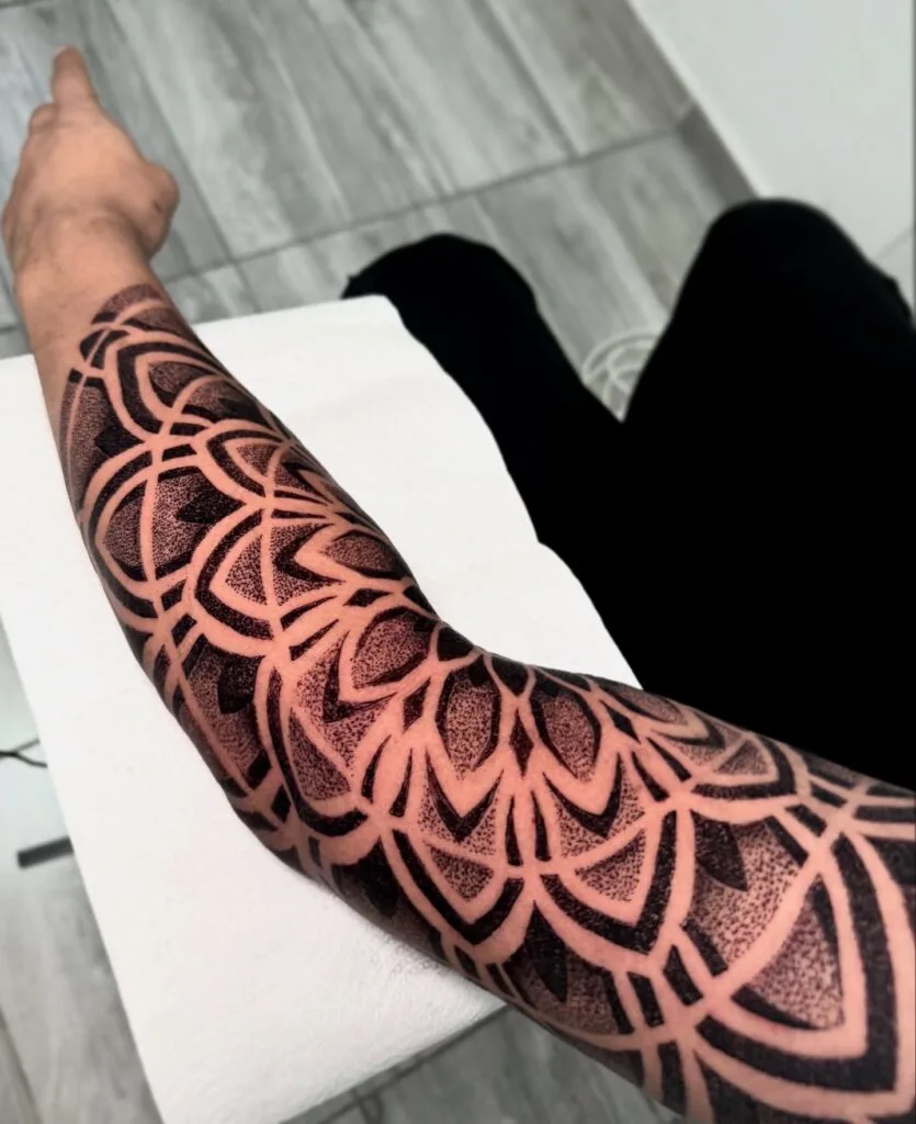 This striking mandala tattoo sleeve covers the arm in bold, geometric patterns that emphasize balance and harmony. The heavy black ink and dot shading bring depth, while the interconnected lines create a sense of flow across the skin. Each curve and angle forms a cohesive rhythm, symbolizing spiritual growth and protection.