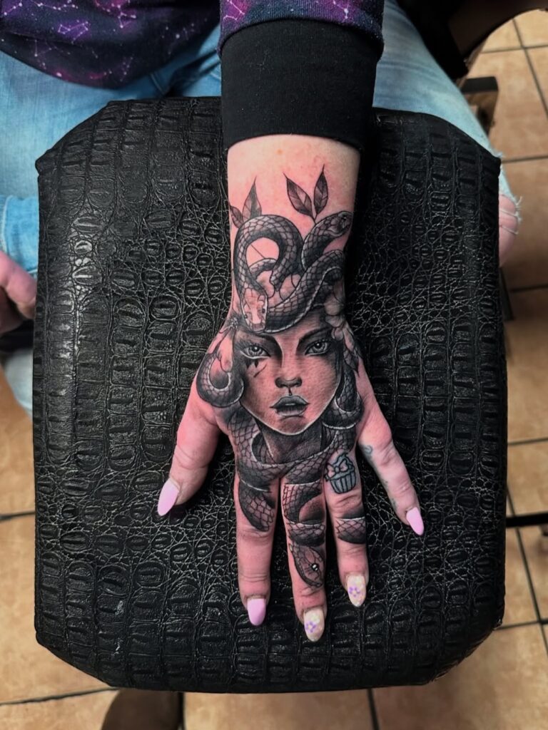 This tattoo showcases Medusa’s face in perfect realism, with snakes wrapping across the hand and extending onto the fingers. The shading is meticulous, creating a powerful contrast that makes the snakes appear as if they are alive and ready to strike. Her piercing gaze captures attention instantly.