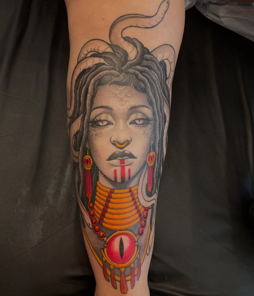 This vibrant tattoo mixes Medusa’s portrait with tribal and African-inspired elements. The golden neck rings, red jewelry, and bold eye details give the tattoo a unique cultural fusion. The snakes twist dramatically, creating balance between realism and stylized art, making it stand out as one-of-a-kind.
