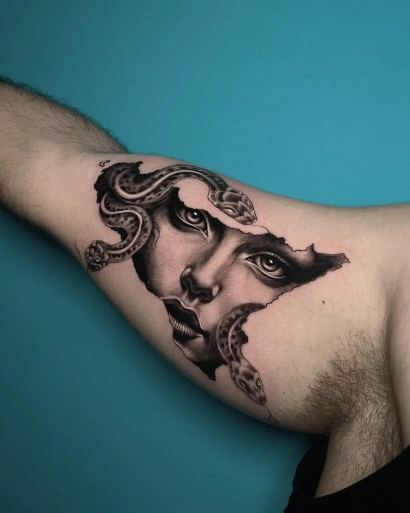This creative tattoo makes it look as if Medusa’s face is revealed beneath the skin, peering through a ripped-skin effect. The shading gives it a hyper-realistic look, making the snakes appear to crawl from within. Her gaze is intense, captivating anyone who sees it.