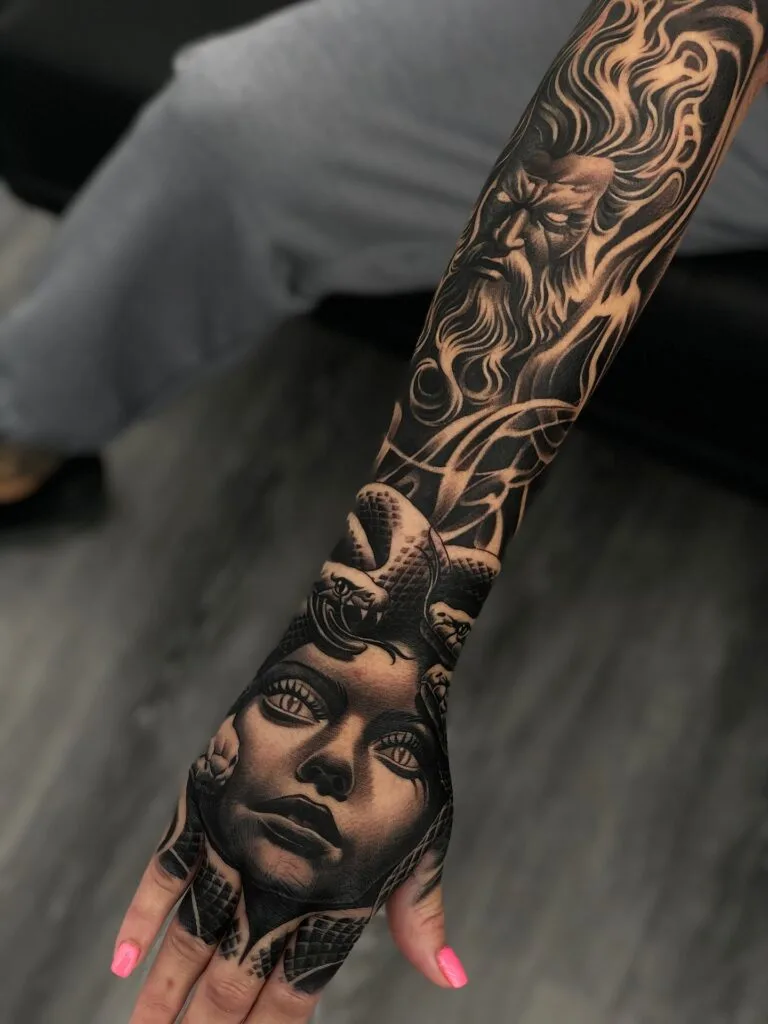 This piece pairs Medusa’s face on the hand with Zeus towering above on the forearm, blending mythology into a single masterpiece. The dark, high-contrast shading gives the entire tattoo a dramatic, almost cinematic effect. Medusa’s eyes are left blank, adding a chilling, stone-like feel to the piece.