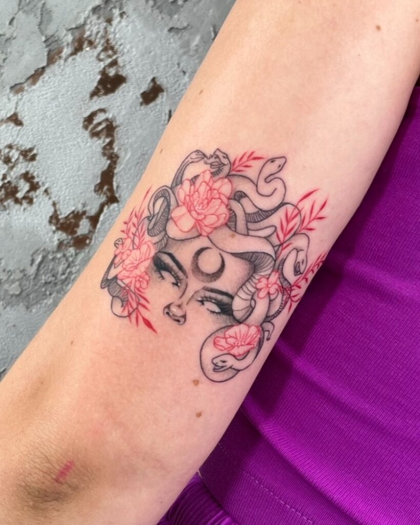 This tattoo combines Medusa’s portrait with delicate flowers and a crescent moon above her head, adding a mystical touch. The snakes are softly rendered, blending harmoniously with the blossoms, creating a balance between danger and beauty.